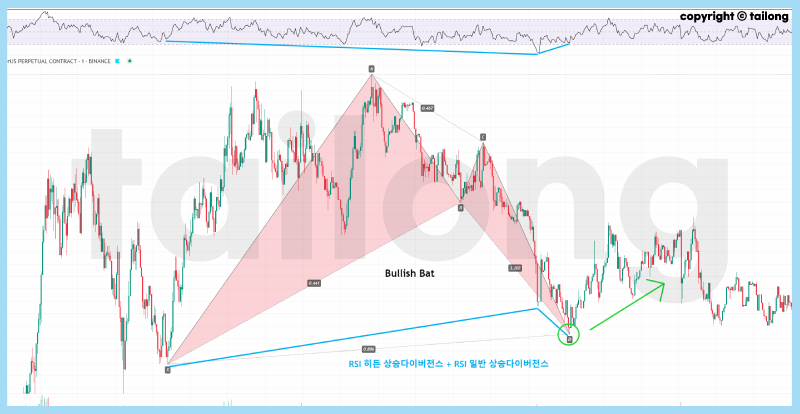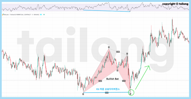 위 그림은 Bullish Bat Pattern과 연계되는 RSI 히든 다이버전스 예시입니다.