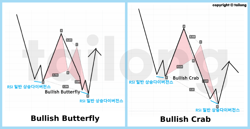 위 그림 우측과 같이 RSI 히든 상승다이버전스가 Bullish Crab Pattern D포인트에서 나오며 강한 반전을 하기도 해요.
