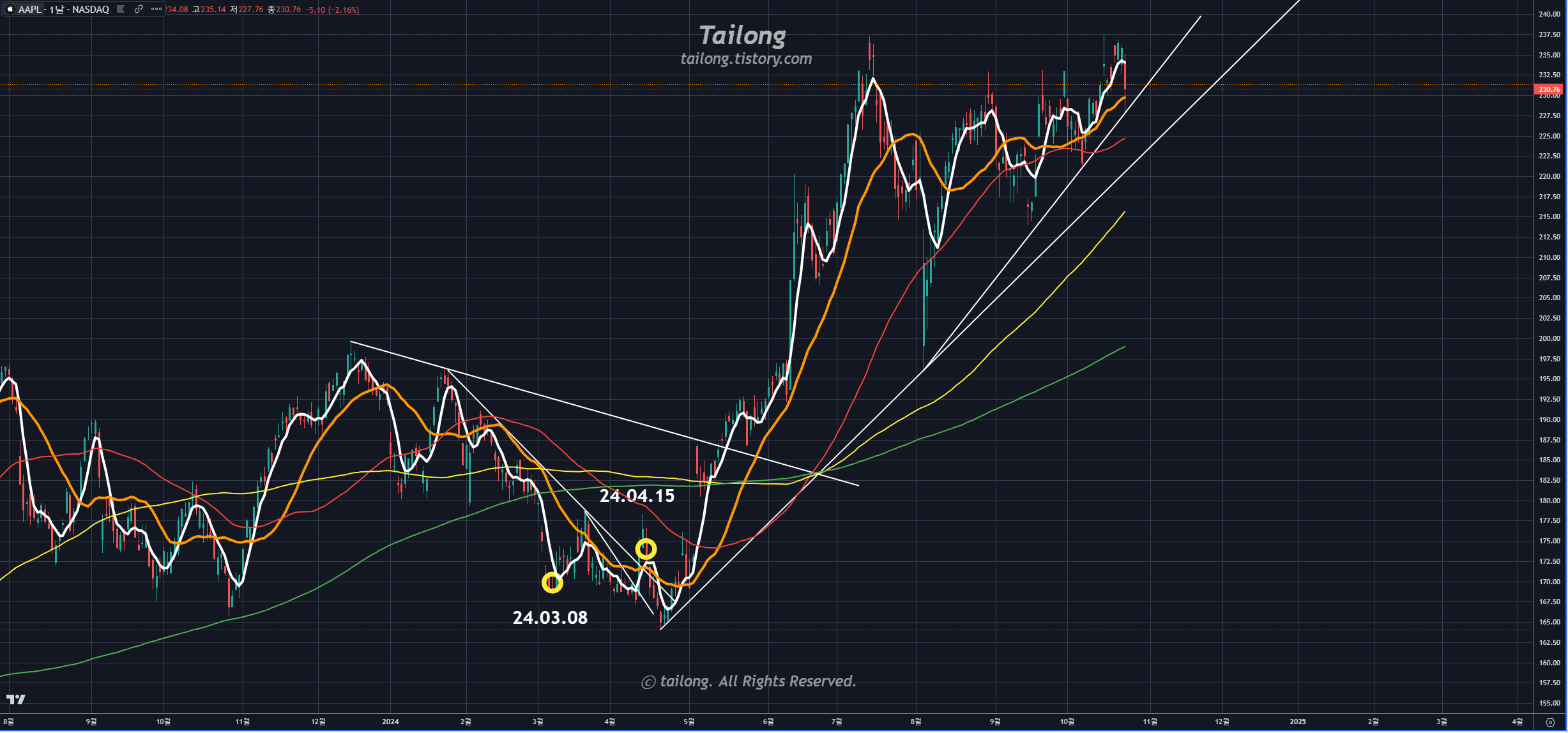 위 차트는 애플 일봉 차트입니다. 노란색 위치는 각각 이전 관점 공유 위치입니다.