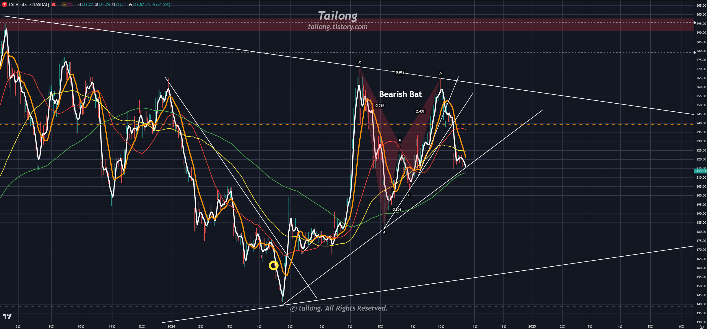 그래서, 테슬라는 일봉상 RSI 과매도에 도달한 시점부터 추적하기 좋아 보여요. 이후 어떤 모습을 그리건 강한 반등을 줄 것이고, 위에 시나리오대로 나온다면 금상첨화죠. 위 조건(Bullish Gartley Patter, ABC 조정파동, 일봉 RSI 히든/일반 상승다이버전스)이 모두 충족된 후 상승하게 된다면, RSI에 노란색으로 표시한 RSI 하락추세선을 상향돌파하게 될 것으로 보입니다. 이렇게 된다면 꽤나 매력적인 자리가 될 거에요.
