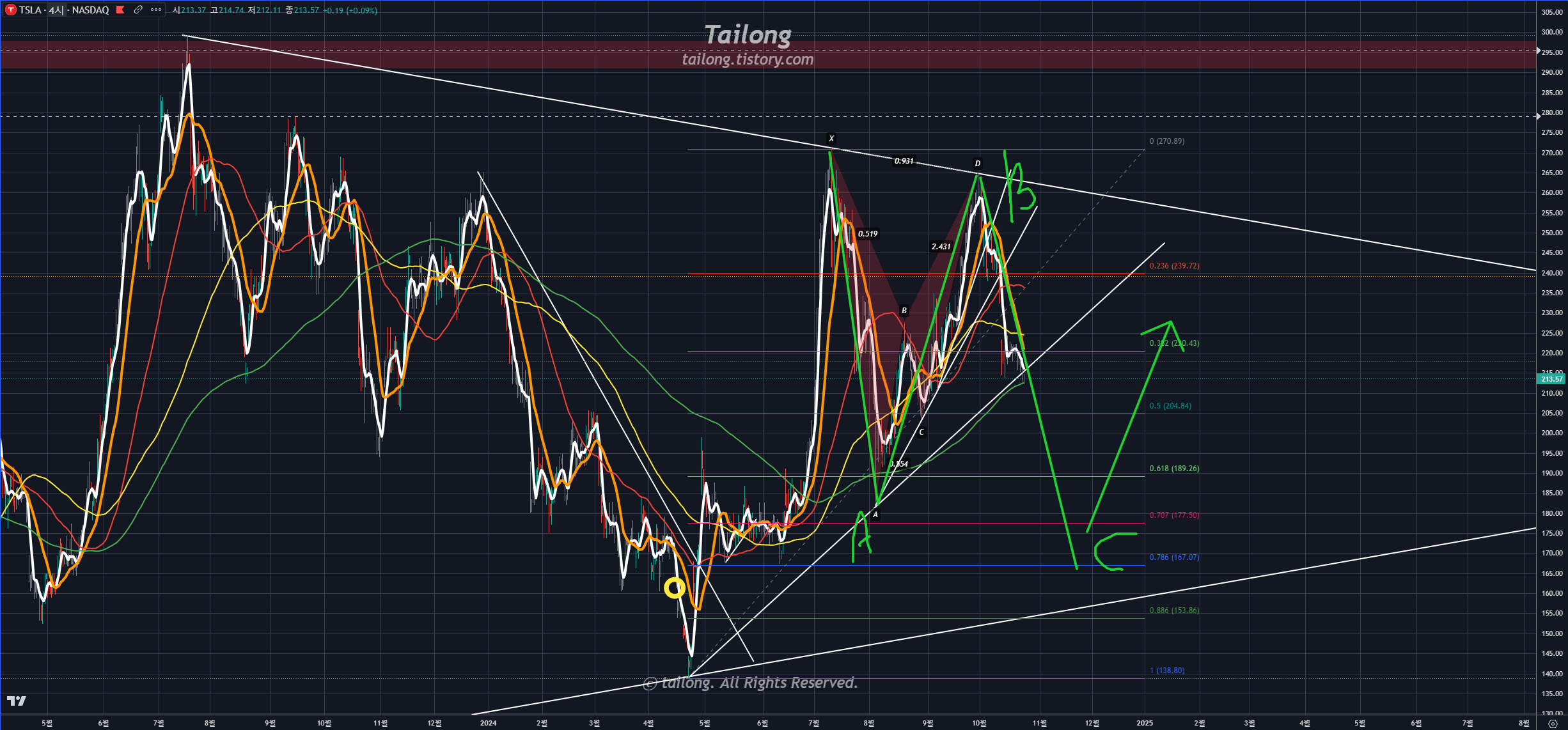 위 차트는 24.04.15 테슬라 관점입니다. 위와 같이 파란색 B파 조정이 마무리된 후 상승을 바라보았으며, 파란색 B파 위치에서 녹색 Bullish Bat Pattern이 나왔으면 했지만, 4월 15일 PRZ를 훼손할 정도로 급락한 후 다음날부터 상승하였습니다. 하모닉 패턴의 PRZ테스트는 못했지만, 엘리어트 파동이론의 B-c파 종결 후 상승한 것이죠.