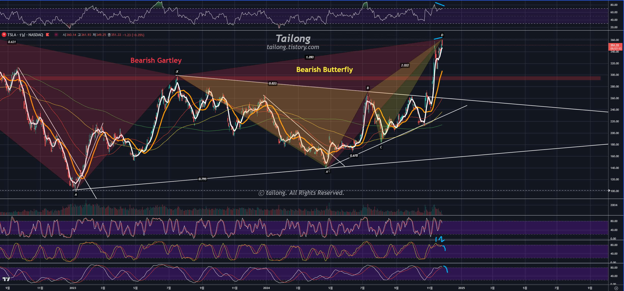 테슬라 일봉 차트상 Bearish Gartley와 Bearish Butterfly PRZ에서 일봉 RSI 일반 하락다이버전스가 생성되었습니다.
