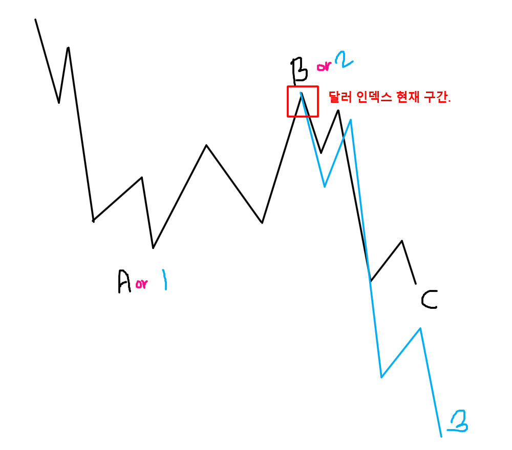 위 차트는 달러 인덱스 주봉 차트입니다. 현재 달러 인덱스는 파란색 ABC 조정을 마친 후 하락반전 중이에요.