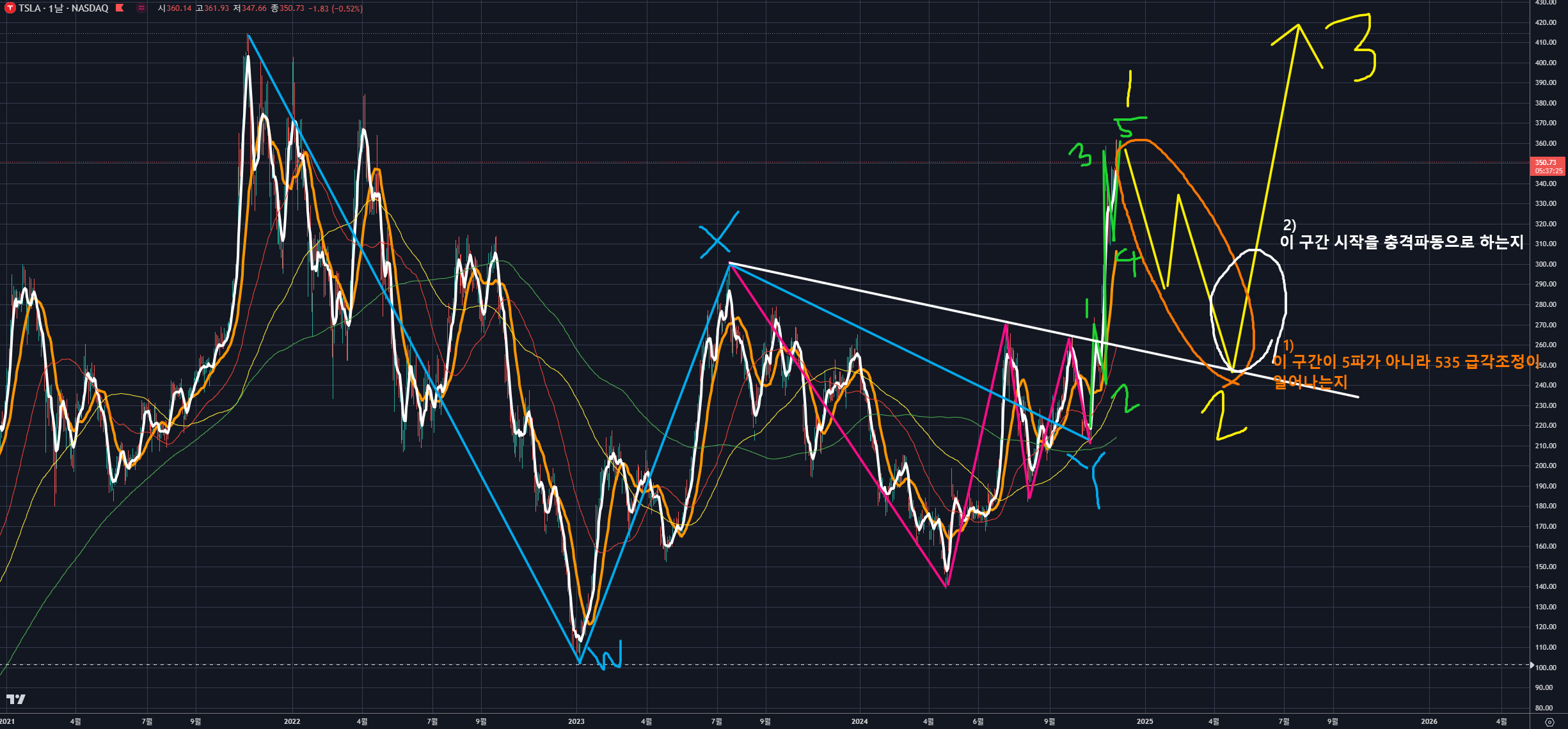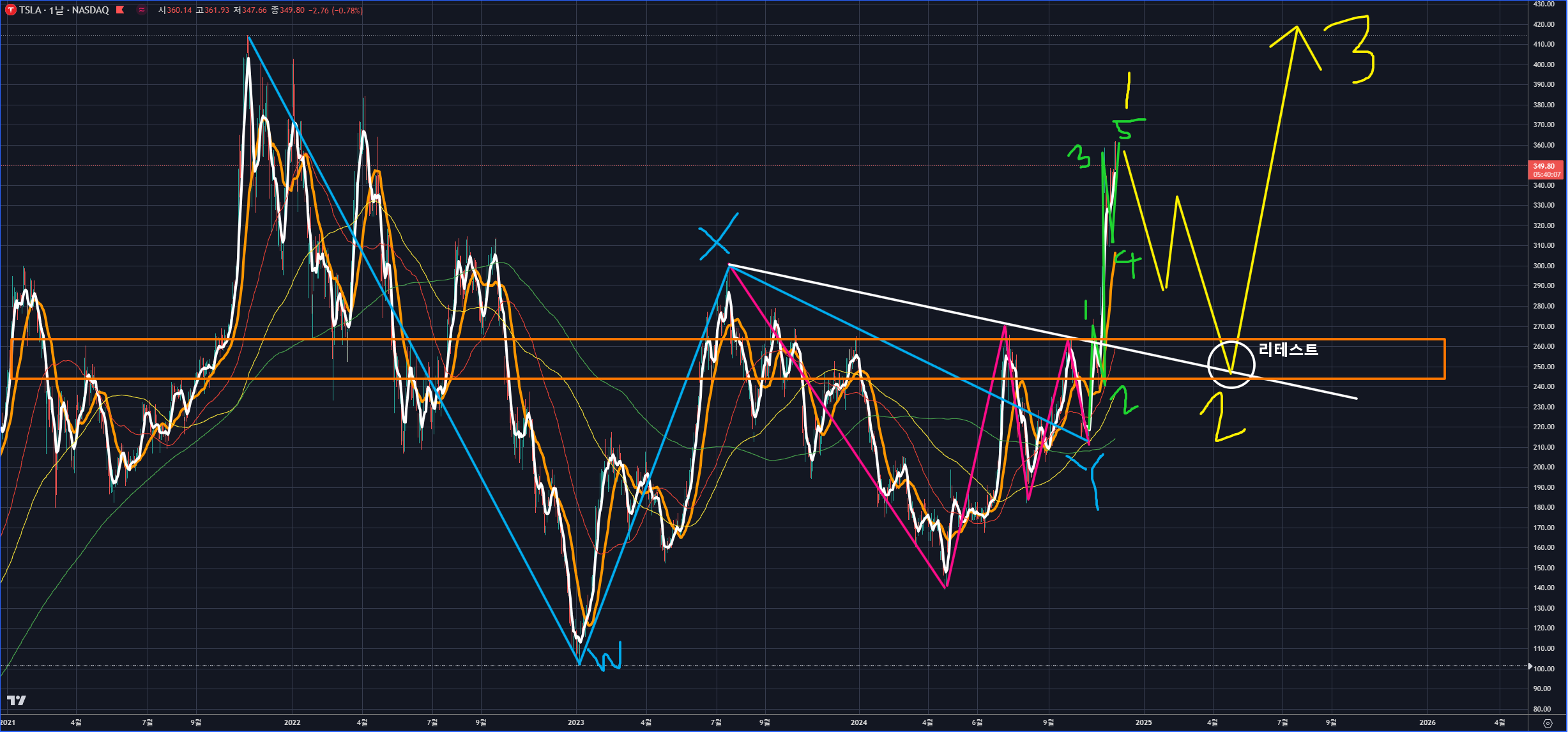 가늠해보기를 테슬라의 A 시나리오 노란색 2파 조정 완료 후 상승하는 시기에 테슬리 주봉 5이평 저점을 높이는 쌍바닥이 나오면 큰 상승을 테슬라, 테슬리가 할 것이고,