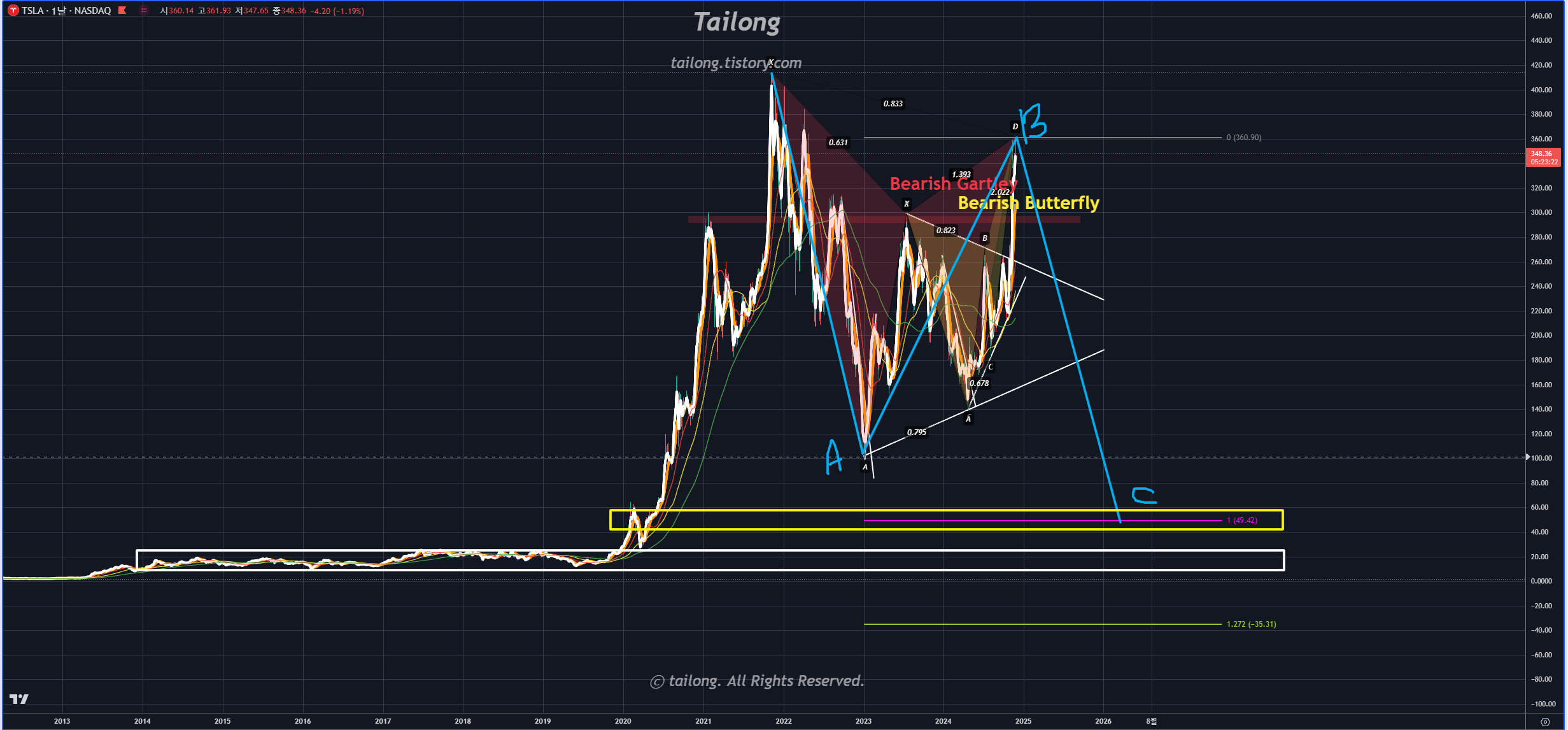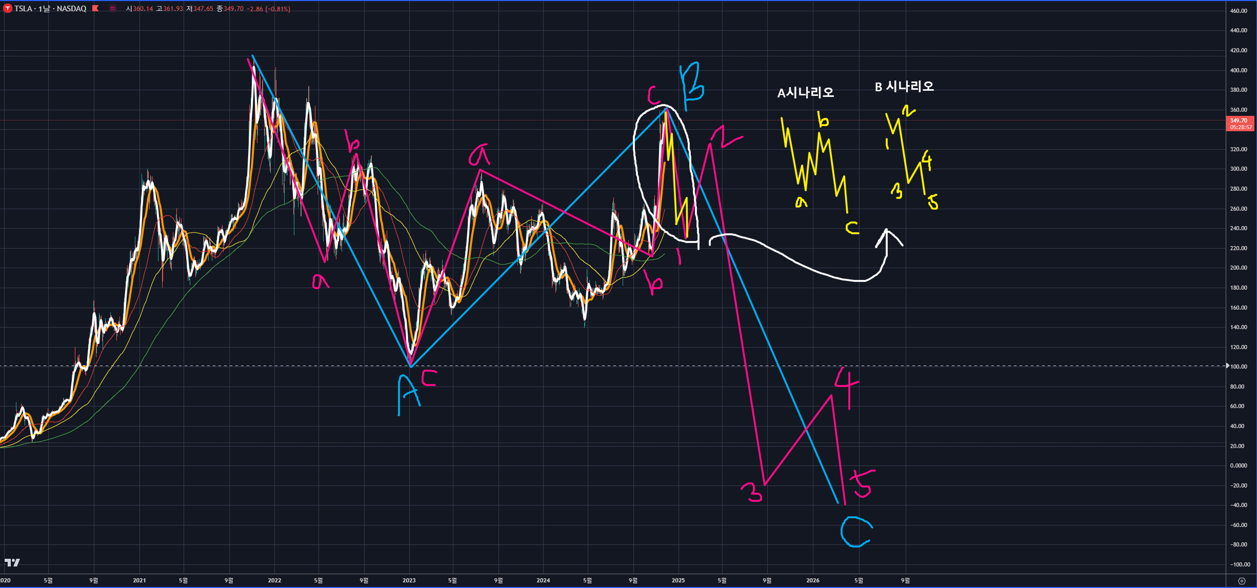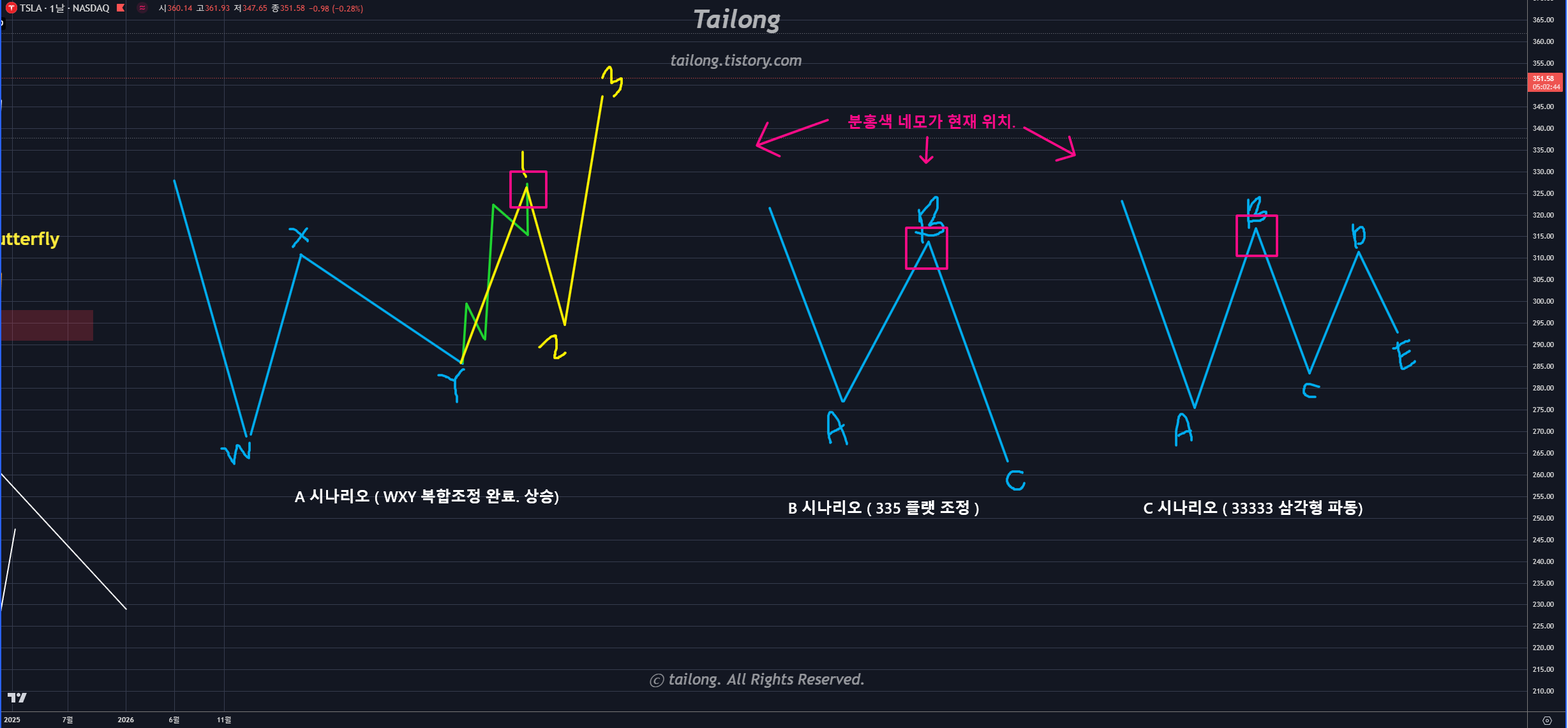 A, B, C 시나리오 모두 하락반전이 예상되는 공통 구간(분홍색 네모)입니다. 그렇기에 테슬라 장투를 위한 사람들도 일부라도 청산하시는 것이 좋아 보여요. 특히 연말이기 때문에, 올해 미장 수익이 없었다면 비과세 되는 250만원 익절분까지라도 정리하시는 것도 좋아보이네요.