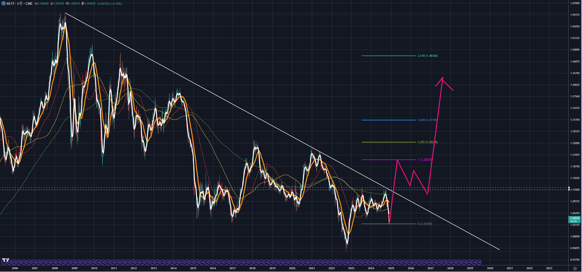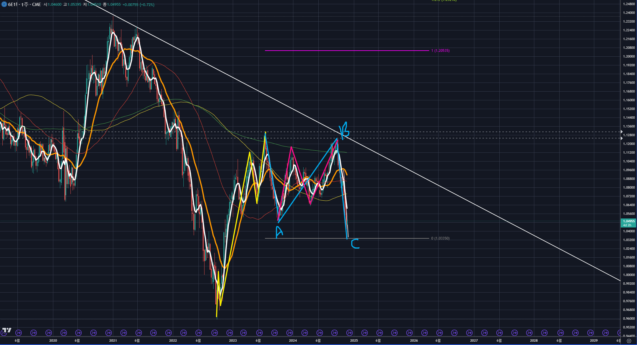 위 차트는 유로FX 주봉 차트입니다. 달러인덱스와 디커플링인 유로 FX이며, 이 종목 또한 파란색 ABC 조정파동을 마무리한 후 강한 반등을 하였어요.