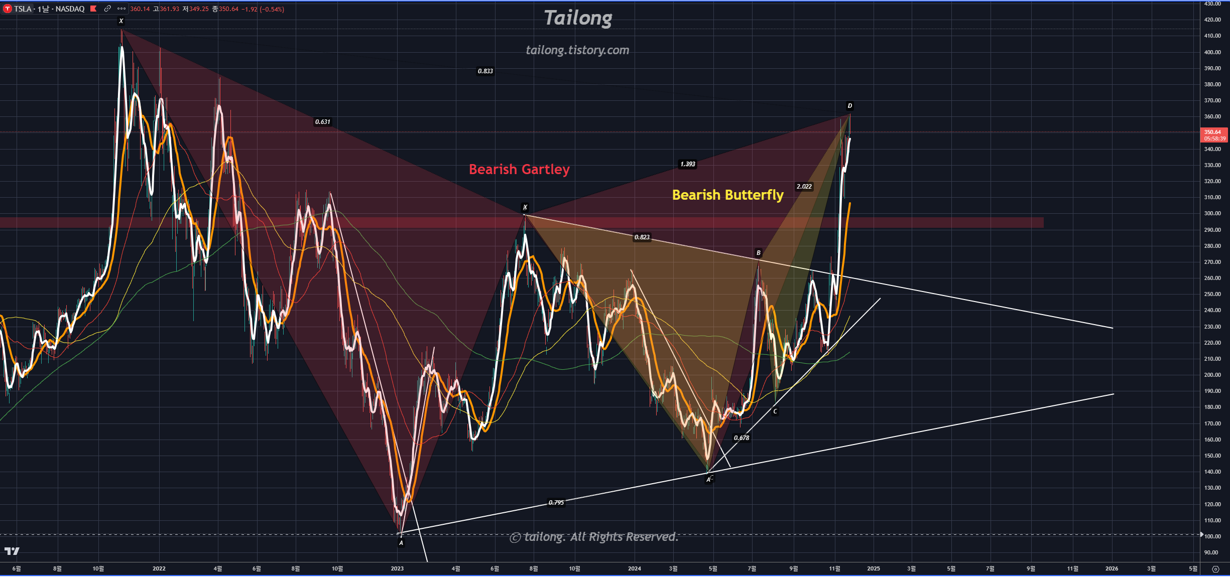 테슬라는 현재 일봉상 빨간색 Bearish Gartley Pattern과 노란색 Bearish Butterfly Pattern의 PRZ를 모두 테스트한 모습입니다.