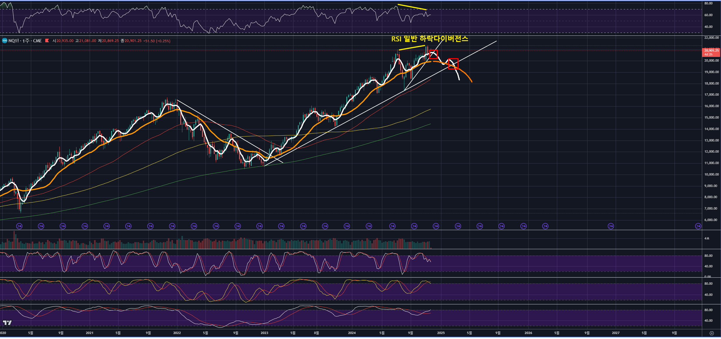 주봉상 RSI 일반 하락다이버전스가 적용 중이며, 가속된 상승추세선 하향돌파 임박인 상태에요.