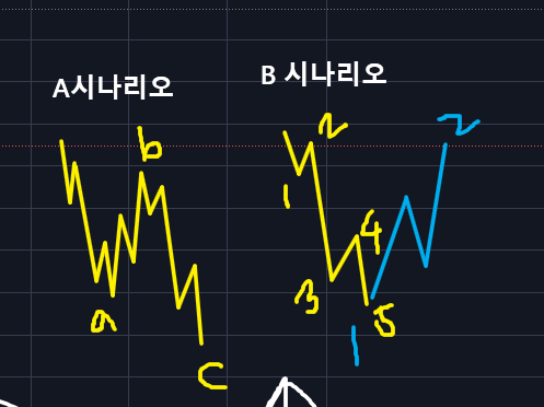 B시나리오라고 봤는데, 파란색 2파 되돌림이 사실은 A시나리오의 노란색 b파 되돌림이었을 수도 있거든요. 그대로 파동의 규모를 고려한다면 이것에 대해서 어느정도 구분이 가능할 거에요.