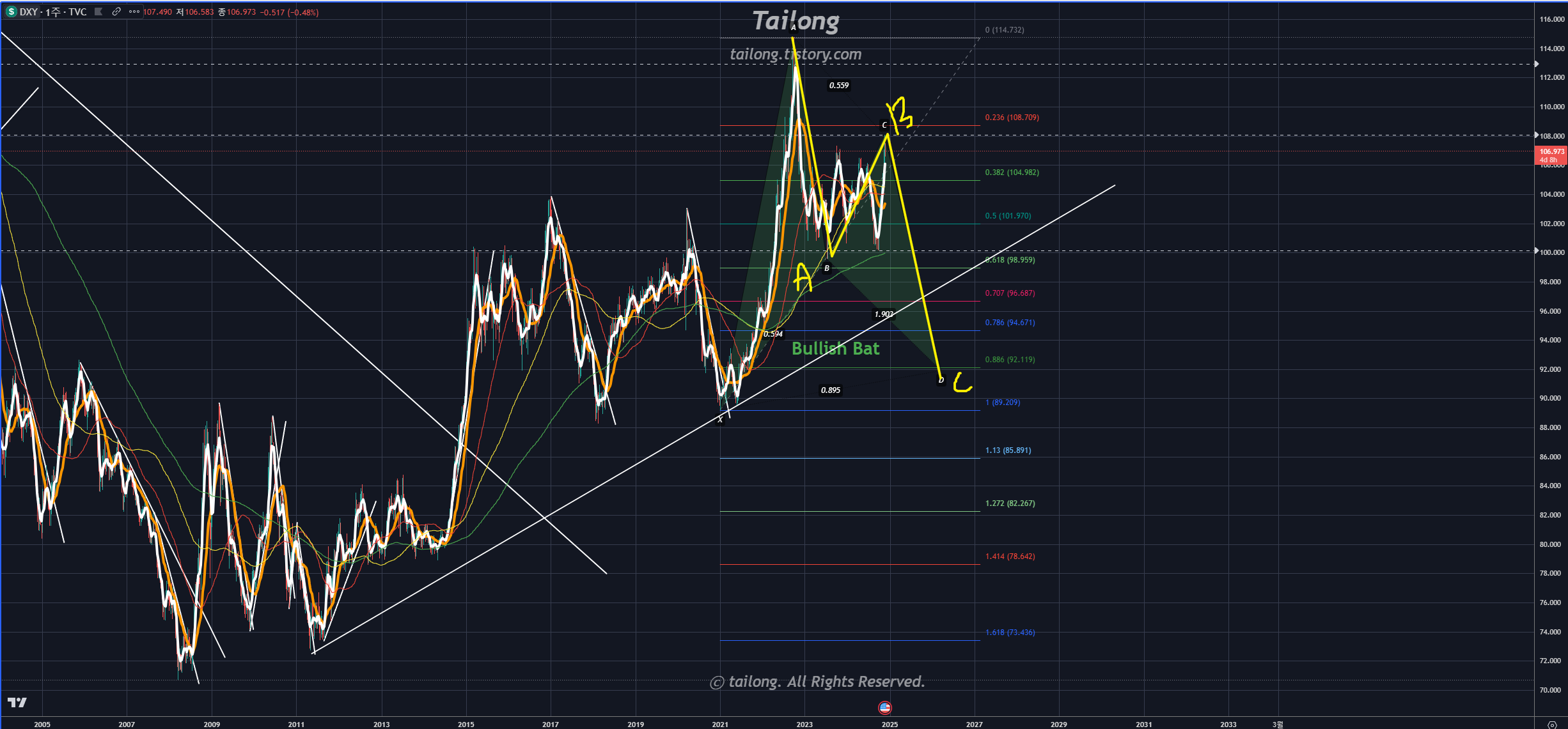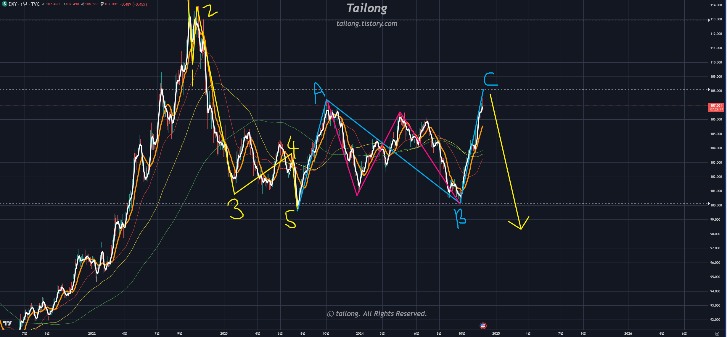 트럼프는 약달러를 선호하는 대통령으로 알고 있습니다. 그리고 11월 25일 미 재무장관 지명으로 달러의 강세가 한 풀 꺾였고요.(ABC 조정파동 1:1자리가 오자마자 반락하며 재무장관 지명)