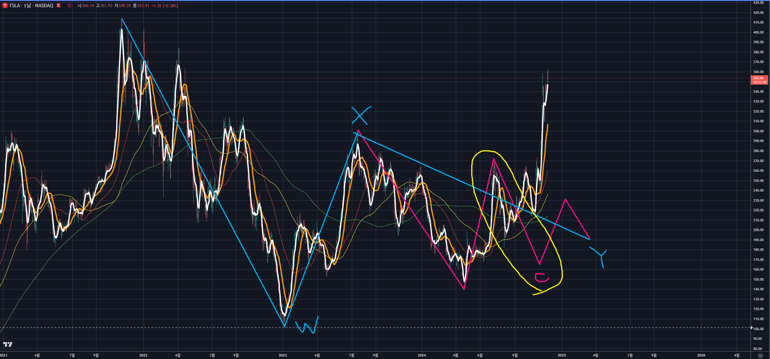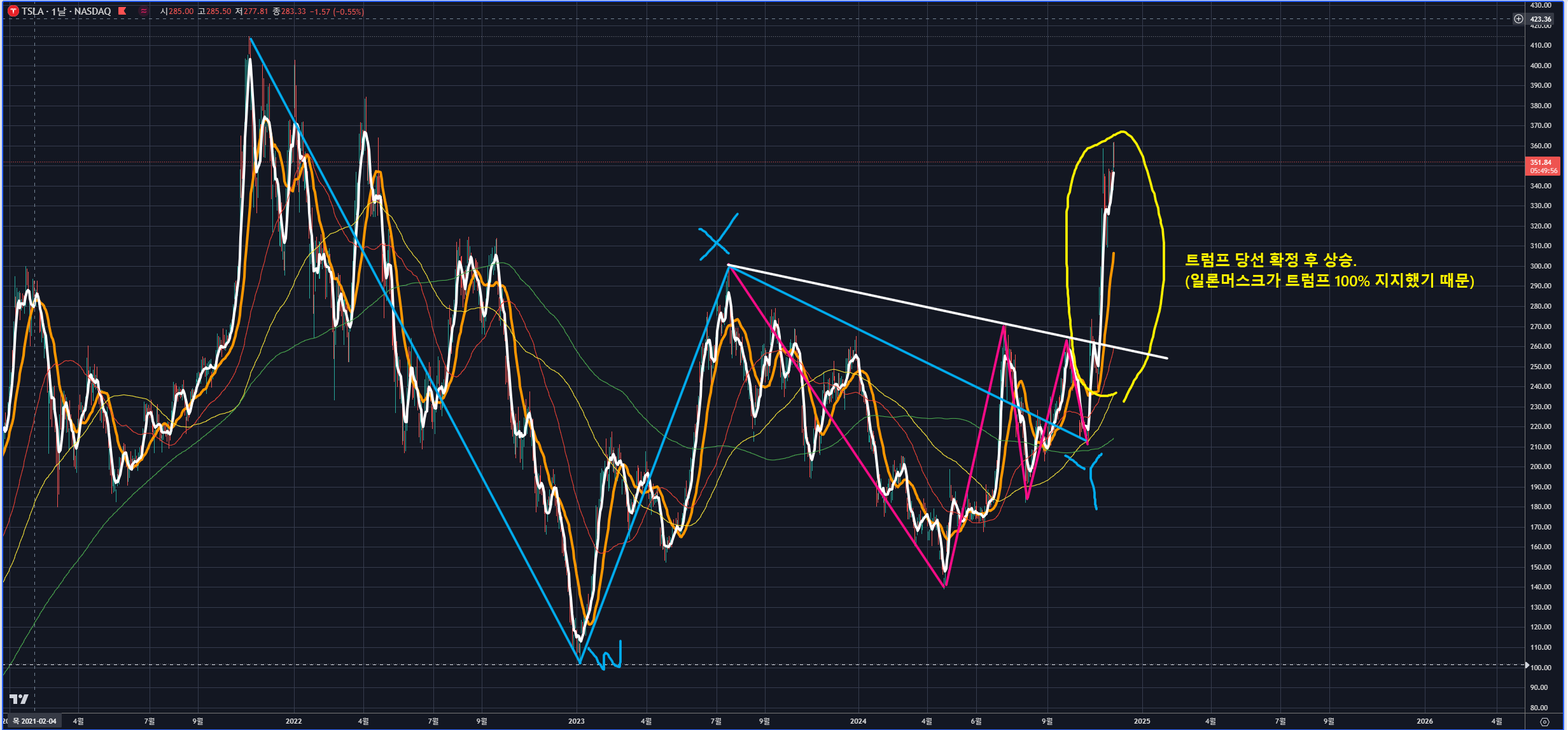 테슬라는 추가 조정을 더이상 주지 않고, 미 대선 시기에 맞춰 하얀색 하락추세선을 상향돌파를 하였습니다. 트럼프 당선이 확정되고, 급등한 모습이죠. 일론머스크가 트럼프를 100% 지지한 것이 매수세가 들어오기 좋았습니다.