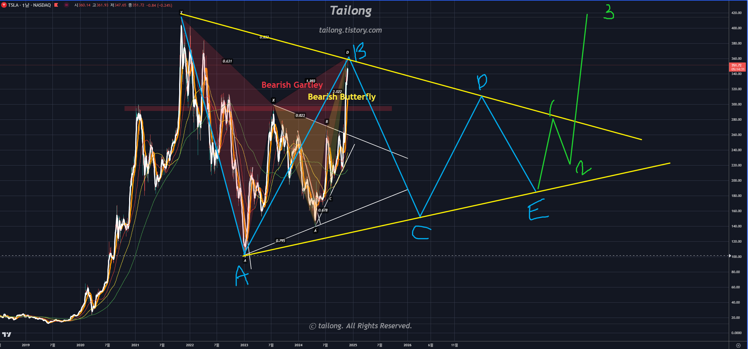 A, B, C 시나리오 모두 하락반전이 예상되는 공통 구간(분홍색 네모)입니다. 그렇기에 테슬라 장투를 위한 사람들도 일부라도 청산하시는 것이 좋아 보여요. 특히 연말이기 때문에, 올해 미장 수익이 없었다면 비과세 되는 250만원 익절분까지라도 정리하시는 것도 좋아보이네요.