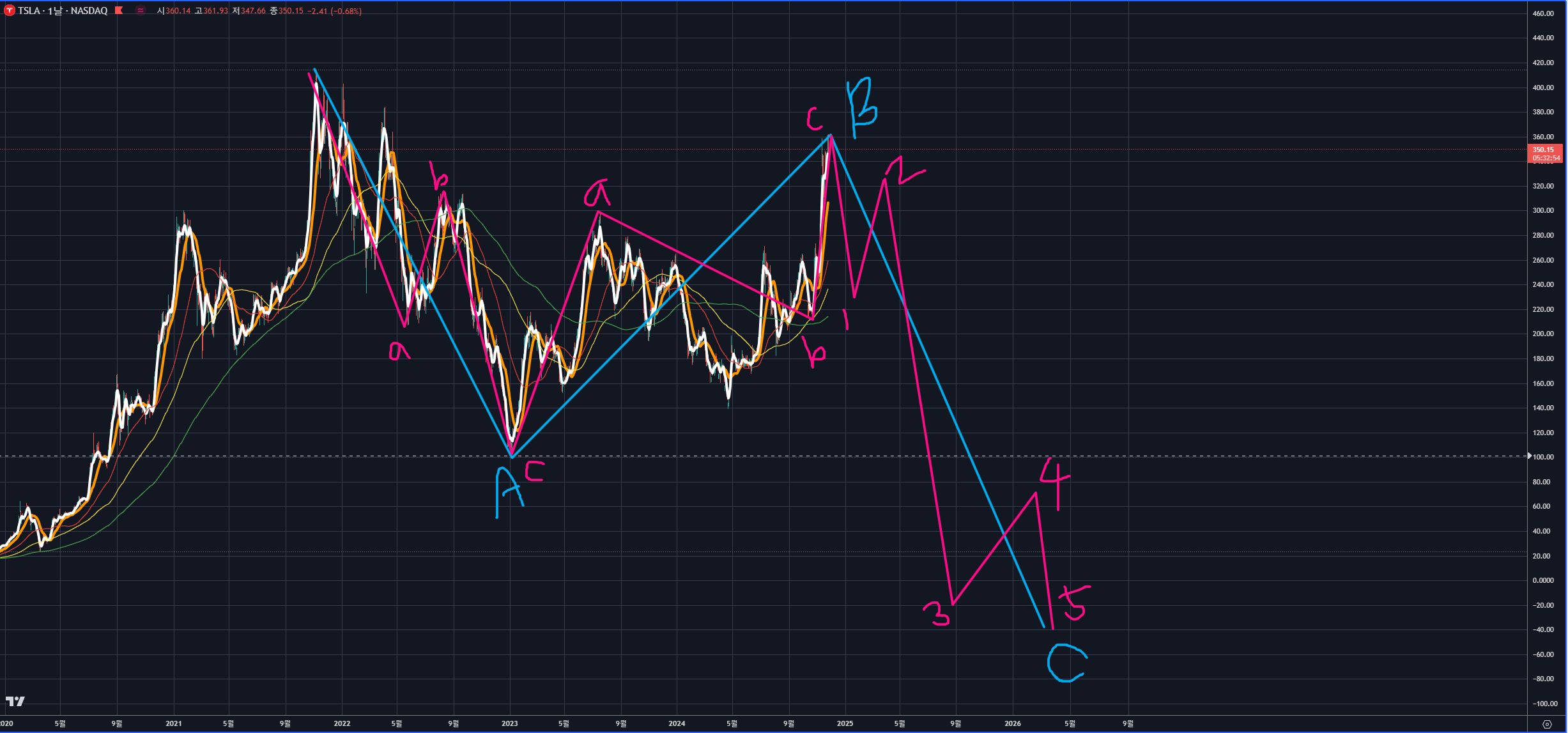 테슬라의 B 시나리오 5파 하락 후 되돌림을 주는 자리에서 테슬리의 5이평 저점을 높이는 쌍바닥 모양이 나온다면, 그냥 ABC로 C파 반등을 한 후 저점 갱신하러 갈 것으로 보입니다.