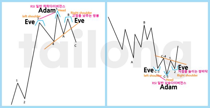 위 그림 좌측과 같이 이브&아담 패턴으로 3파와 5파 고점을 형성하고, RSI 일반 하락다이버전스가 나오며 1개의 상승 동인파동이 종결된 후,