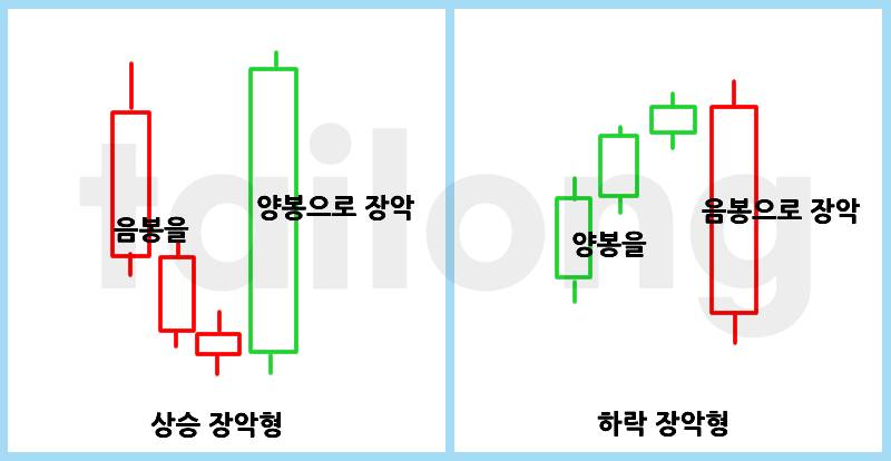 위 그림의 좌측과 같이 하락하던 음봉을 장대양봉으로 잡아먹는 상승 장악형과