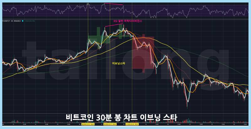 만약 30분 봉에서 위와 같은 파형이 보이고 RSI 다이버전스 등이 보였다면, 4시간 봉이나 일봉 급에서 이브닝스타가 나오고 있을 수 있죠.