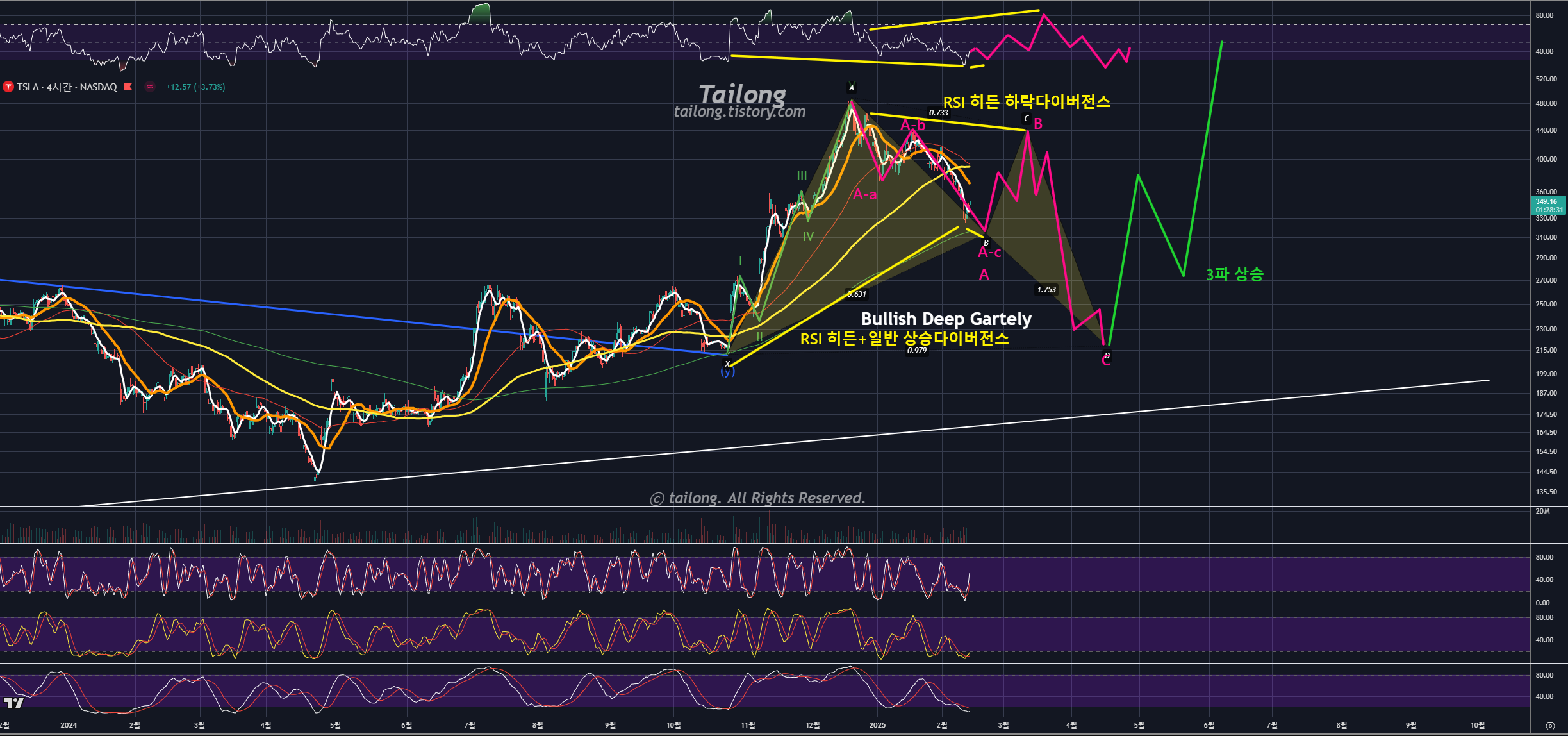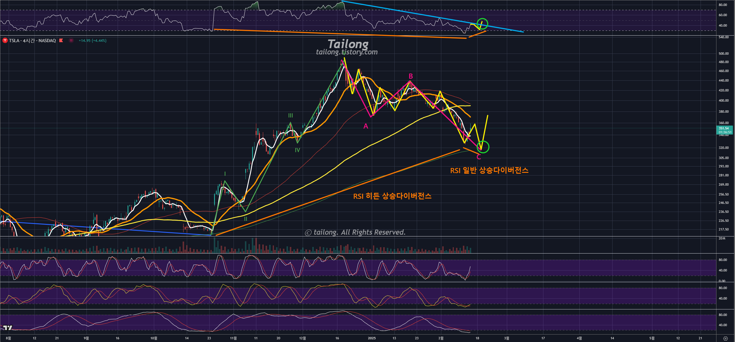 4시간 봉에서 보면, 분홍색 335 플랫 조정이 명확히 보이는 구간이에요. RSI 과매도 상태로 RSI 히든 상승다이버전스 또한 적용 중입니다.