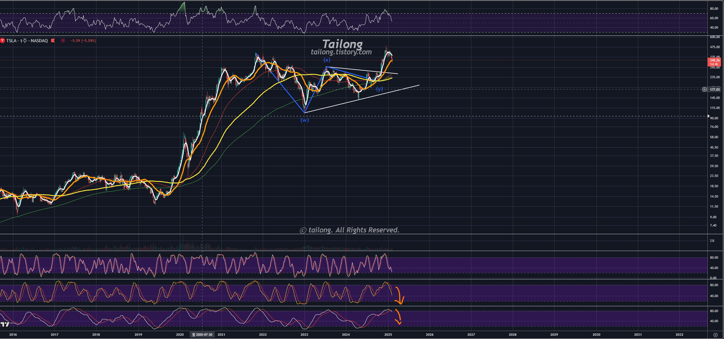 위 차트는 테슬라 주봉 차트입니다. 주봉에서 이미 스토캐스틱 533, 1066, 201212 우하향 진행 중입니다.