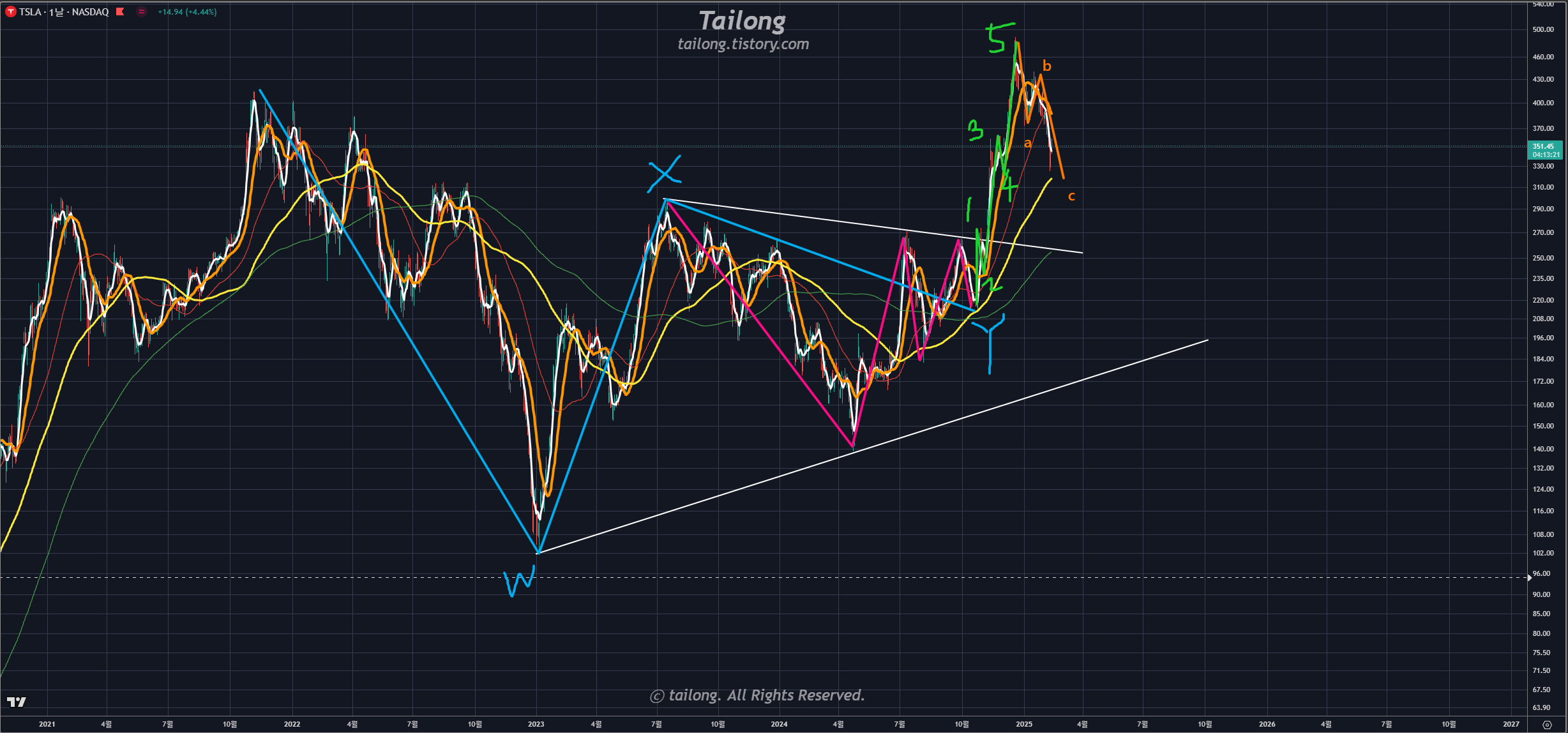 위 차트는 테슬라 월봉 차트입니다. 위 차트의 초록색과 같이 이미 5파가 다 나왔기 때문에 하락이 시작되는 것이며,