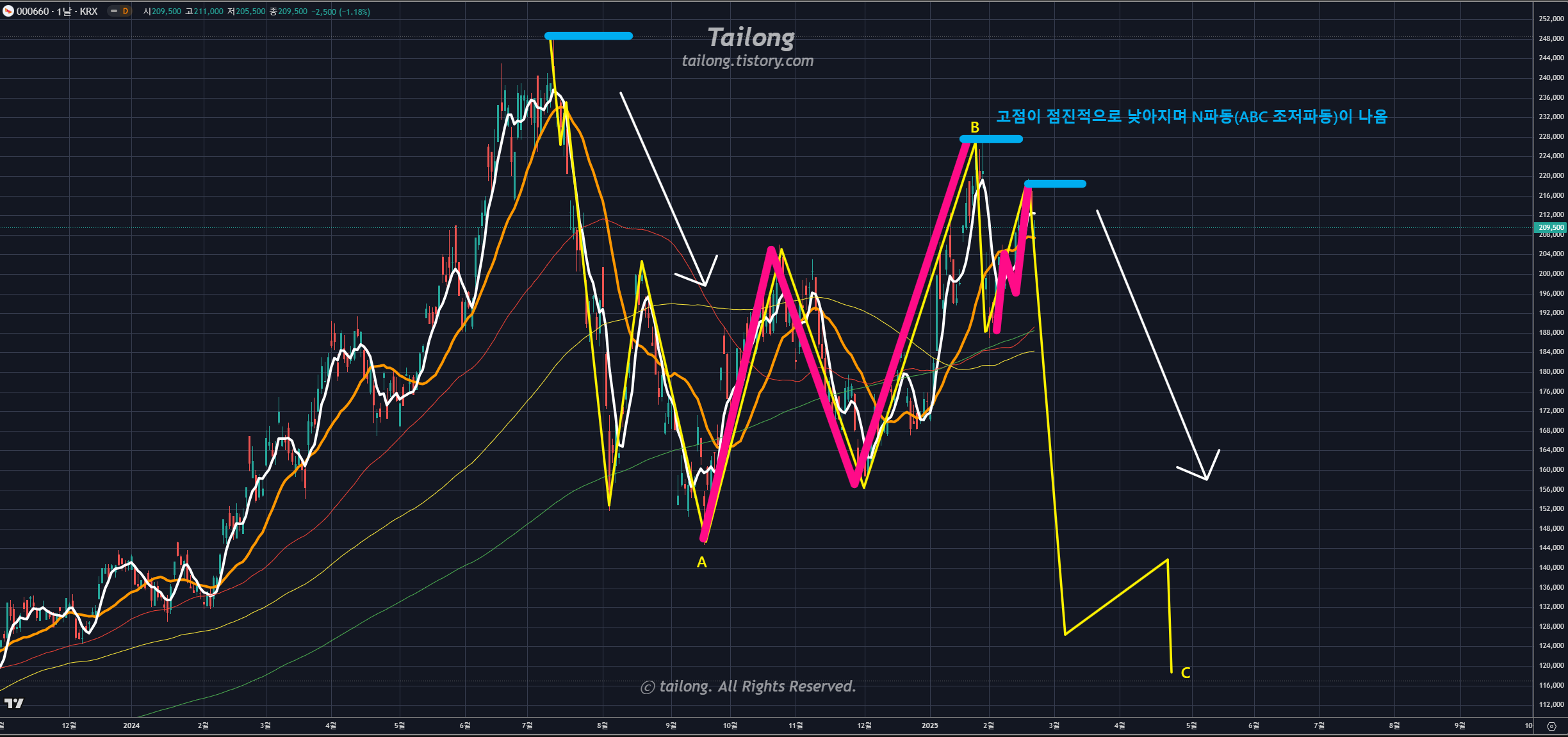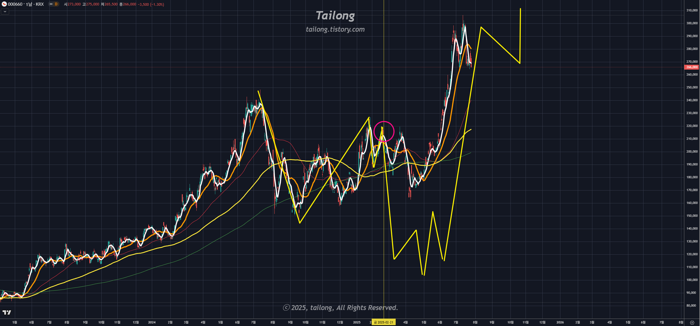 지난 2월에 분홍색 동그라미부근에서 하락하는 분석글을 올렸습니다. 현재 25년 7월 27일 기준으로는 저점을 갱신하지 못한채 가격조정이 아니라 기간조정을 마친 후 상승한 모습입니다. 노란색으로 표시한 것이 2월 23일에 올린 가격흐름이었는데 하이닉스의 매수세가 강했네요.