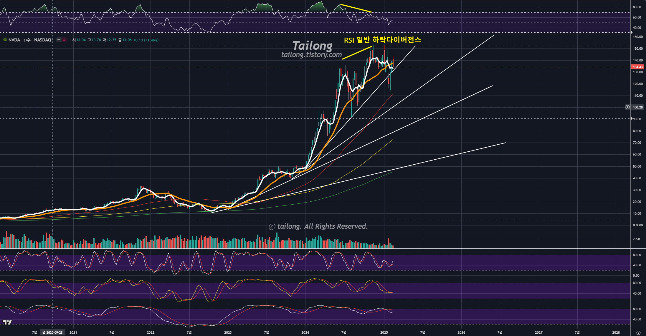 위 차트는 엔비디아 주봉차트입니다. 이미 주봉상 RSI 일반 하락다이버전스가 나오고 크게 급락을 한 후 반등 중에 있습니다.