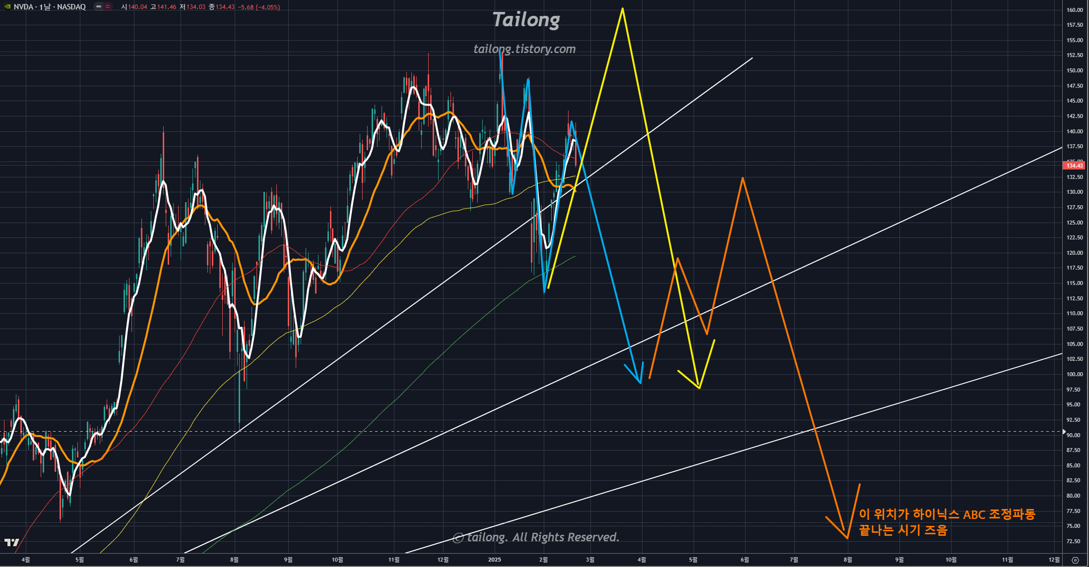 어떻게 되건 25년 4월에는 엔비디아는 하락하고 있을 것 같고, 8~9월 정도에 SK하이닉스가 ABC 하락을 끝내고 저점을 형성하고 있을 때 엔비디아 또한 저점을 형성하고 있지 않을까싶네요.