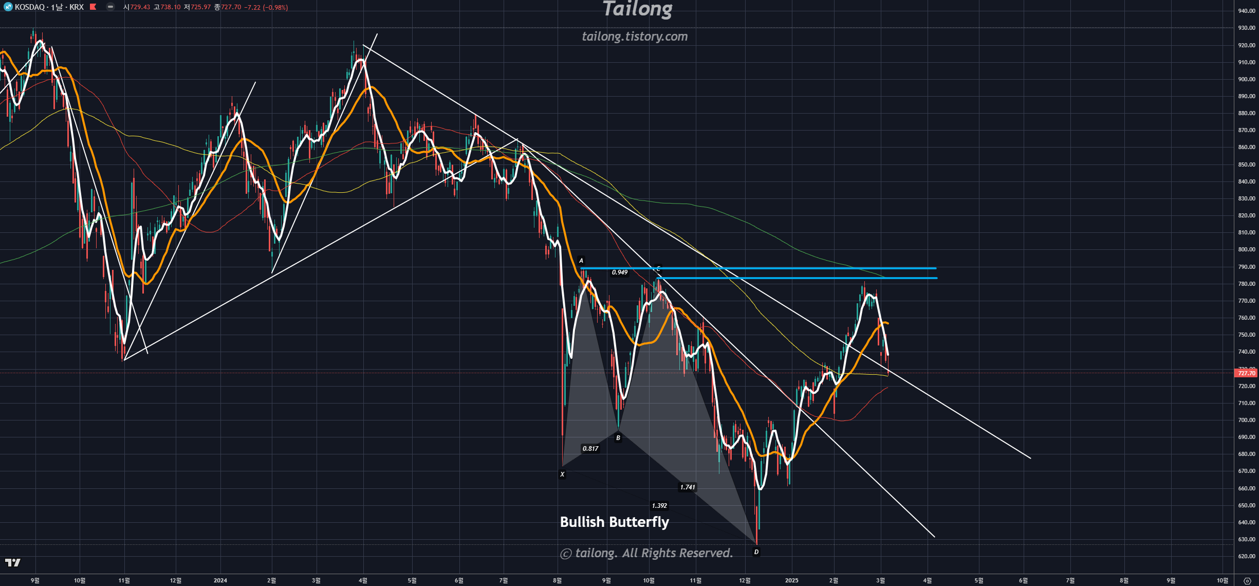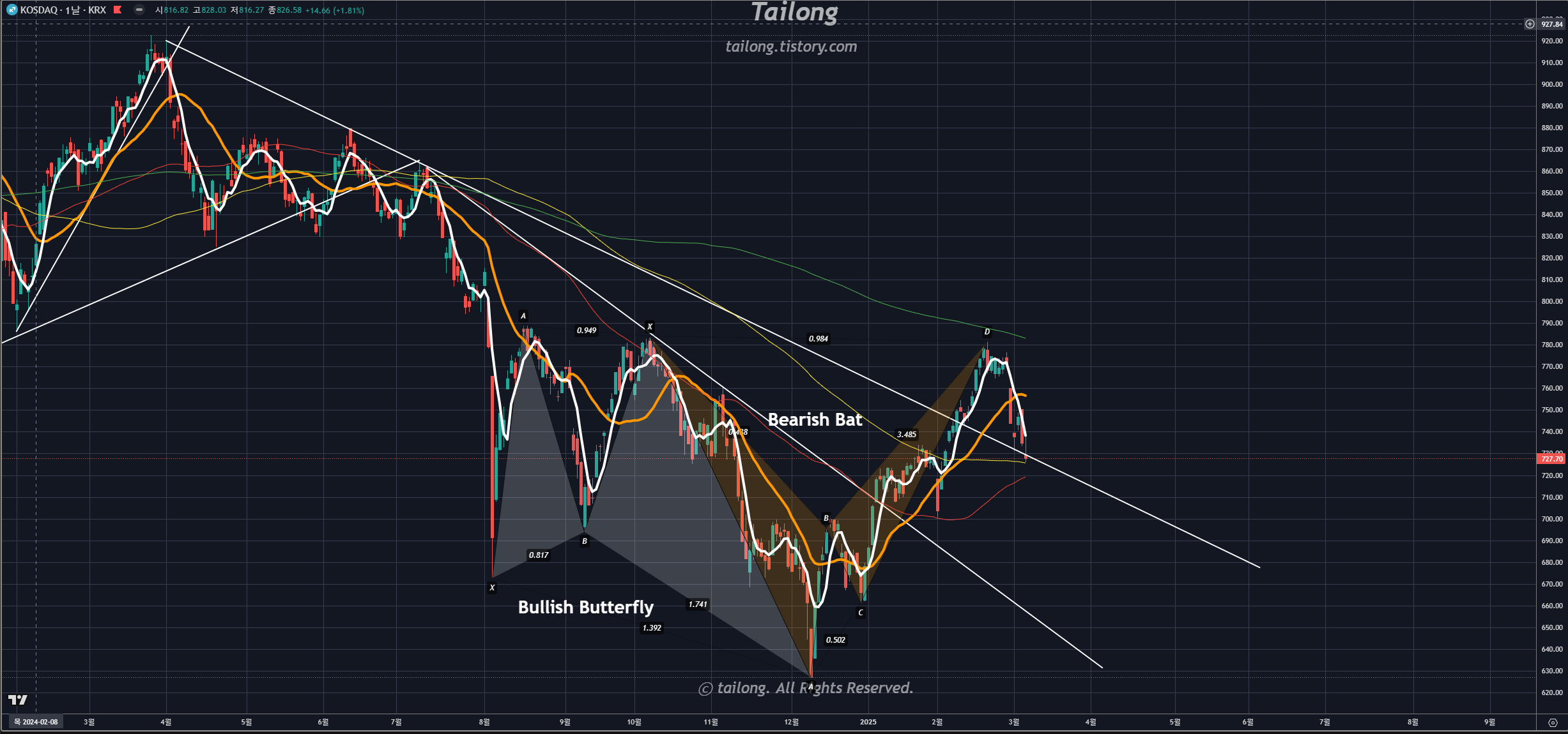 위 차트는 코스닥 일봉 차트입니다. 현재 주황색의 Bearish Bat Pattern의 PRZ를 닿고 하락 중인 상태입니다.