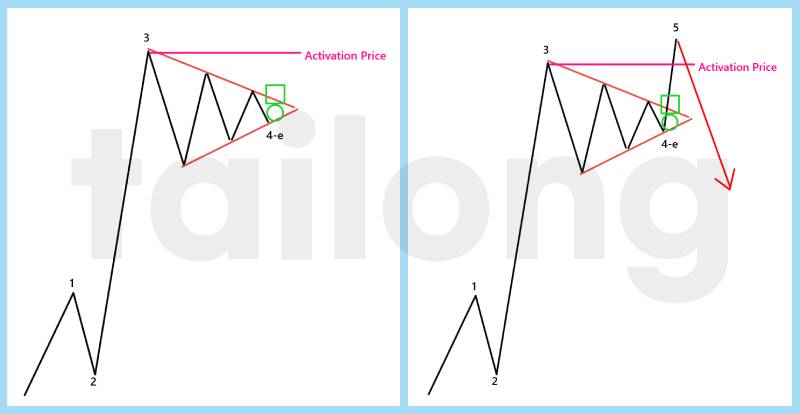 위 그림 좌측) 과 같이 4파 삼각형 파동이 만들어졌을 경우, 이 삼각형 파동이 인지되었을 때 4-e파인 초록색 동그라미에서 진입하거나, 4-e파 종결 후 삼각수렴의 상단을 상향돌파하는 초록색 네모에서 진입할 경우 트레일링 스탑을 3파 고점으로 잡는 것입니다.