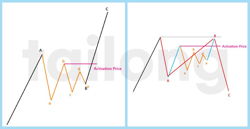 4파의 삼각형 파동 외에도 B파 삼각형 파동에서도 트레일링 스탑을 사용할 수 있습니다.