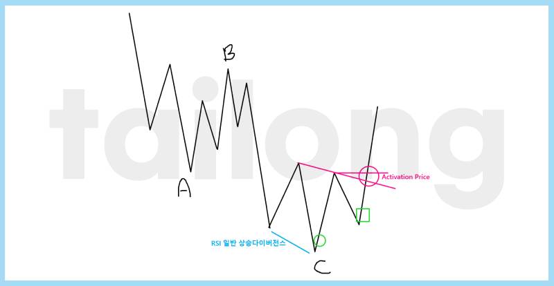 N파동(ABC 조정파동)으로 조정하는 자리에서 RSI 일반 상승다이버전스(매도는 반대로)가 나온 후 상승하는 초록색 동그라미 자리, 혹은 이후 저점을 높이는 초록색 네모 자리에서 진입했을 경우 하락추세선이 상향돌파되는 지점 혹은 저점이 높아지는 쌍바닥 직전의 고점(1 or A파)에 Activation Price를 설정합니다. 이 구간을 강하게 상향돌파하지 못할 경우 가격은 아래로 다시 내려갈 가능성이 있기 때문이죠. 상향돌파하게 되면 지지부진하게 움직이기 보다는 장대양봉으로 상승하기 때문에 트레일링 스탑 주문이 활성화되더라도 꽤나 높은 수익권에서 트레일링 스탑이 체결됩니다. 보통 이렇게 트레일링 스탑을 설정하는 것은 4시간 봉 이상에서 설정하는 편이에요. 30분 봉 이하 근거로 진입할 경우에는 트레일링 스탑은 설정하지 않는 편입니다.