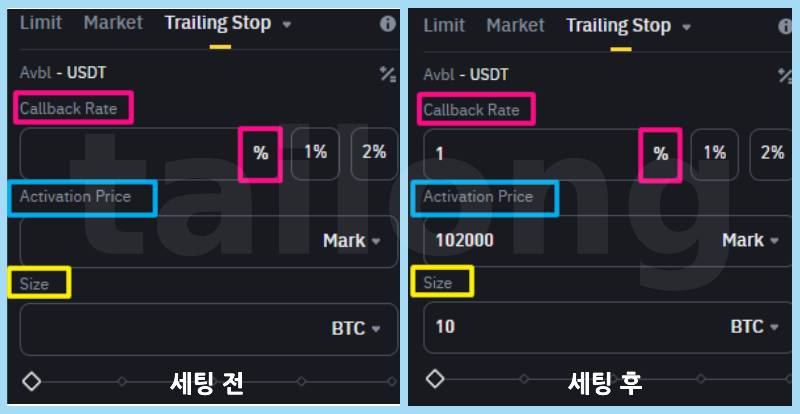 위 사진은 바이낸스(PC) 트레일링 스탑 설정 창입니다.