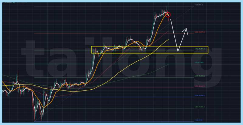 하얀색 화살표와 같이 그대로 하락해서 노란색 수평매물대와 피보나치 0.382 되돌림에서 익절청산이 되면 가장 좋으나,
