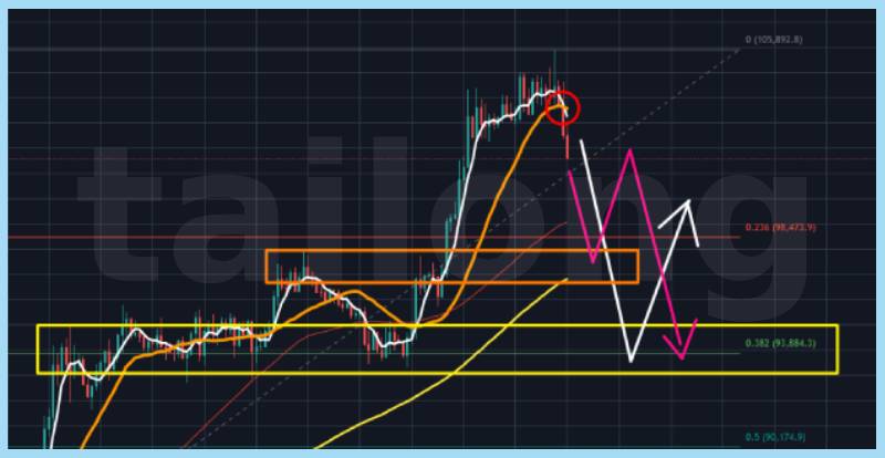 분홍색 흐름대로 주황색 수평매물대에서 한 번 반등한 후 하락하거나, 주황색 수평매물대에서 반등 후 고점을 높힐 가능성 또한 있기 때문에, 일부 혹은 전부를 이 주황색 수평매물대 부근(0.236 피보나치 되돌림 부근)에 트레일링 스탑 주문을 걸어놓는 것이죠.