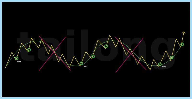 위 그림에서 초록색 30분 봉이 '우상향'할 때, 노란색 5분 봉이 '동일하게 우상향'하는 지점에서 매수를 해야합니다. 이는 초록색 동그라미로 표시한 곳이며, 그 중 제일 좋은 위치는 하얀색으로 'Best'라고 적은 곳이에요. 오르면 오를수록, 그러니까 더 위에 초록색 동그라미일수록 승률과 손익비가 떨어집니다. 언제 급락할지 모르기 때문이에요.