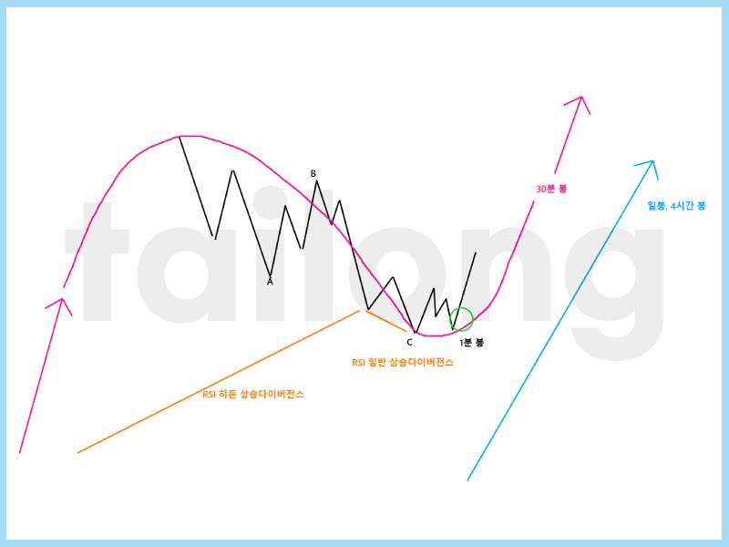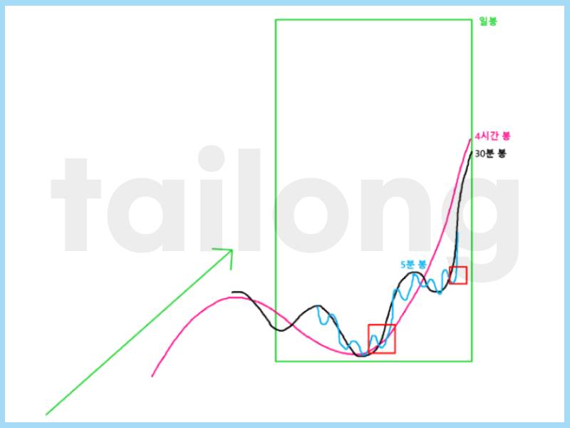 30분 봉이 이미 우상향을 시작했더라도, 상승을 얼마 하지 않았다면 1분 봉 혹은 5분 봉이 우하향하다가 다시 우상향할 때 진입할수도 있고요.