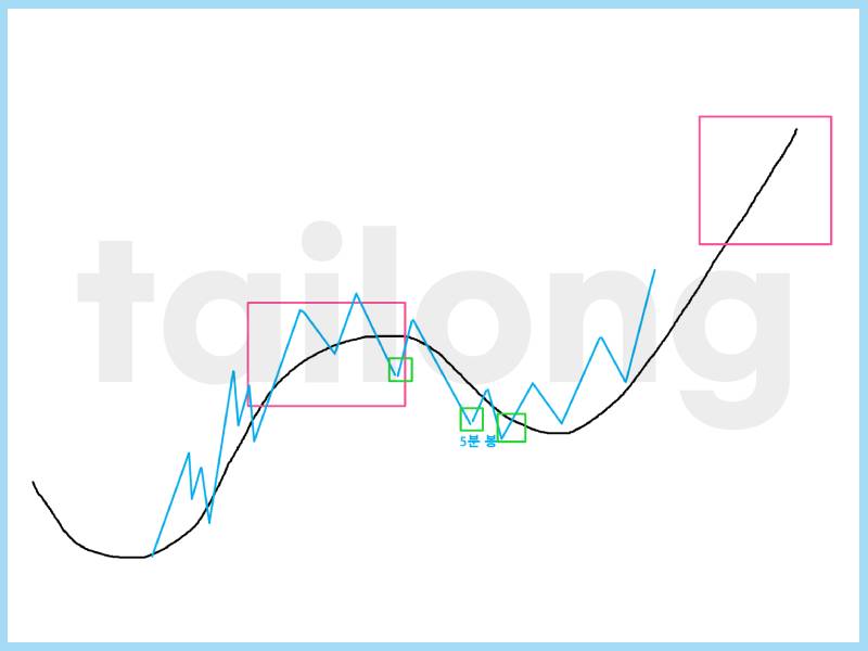 위 그림의 초록색을 30분 봉, 위 그림의 노란색을 5분 봉이라고 생각해봅시다. 편의상 노란색 5분 봉은 둥근 파형으로 그리지 않았지만, 상승과 하락하는 등락은 확인될 거에요.
