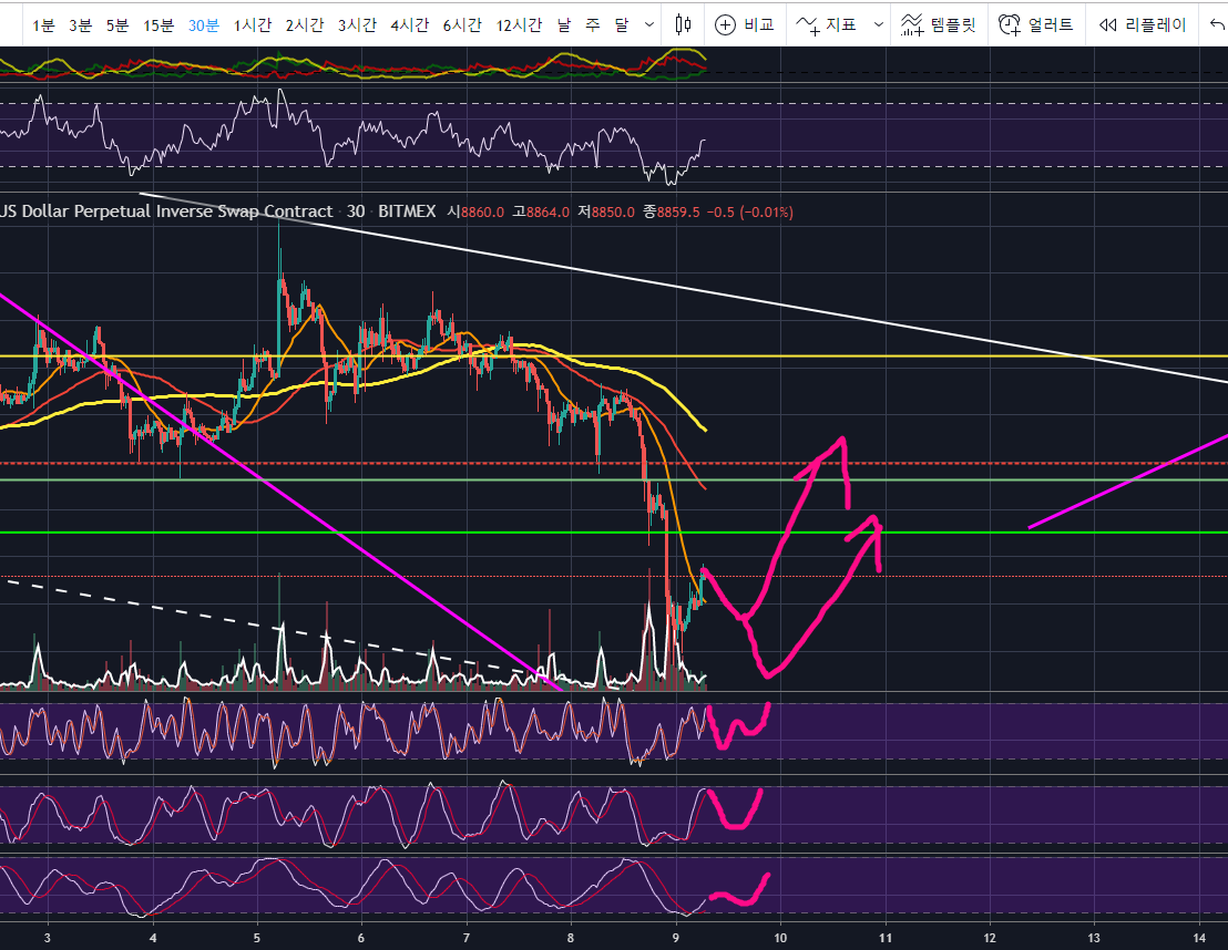 후자가 상승에 대한 힘이 더 강할 것으로 보고있으나, 꼭 저점으 갱신하지 않을수도있으니 내려왔다가 상승할 시 추격 숏 보다는 롱을 조금씩 모아가는 것이 좋아보입니다.