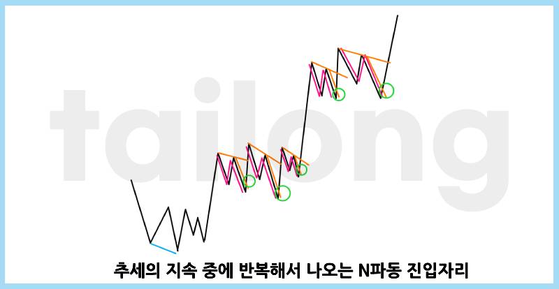N파동의 대부분의 활용은 눌림목에서의 진입에 특화되어 있다고 생각합니다. 크게 보았을 때 추세의 조정에서 주로 나오지만, 추세와 조정이란 것들을 모른다고 하더라도 명확히 N자모양이 나온 후 반전근거를 갖추고 반전하면 그곳을 N파동이라고 볼 수 있죠.