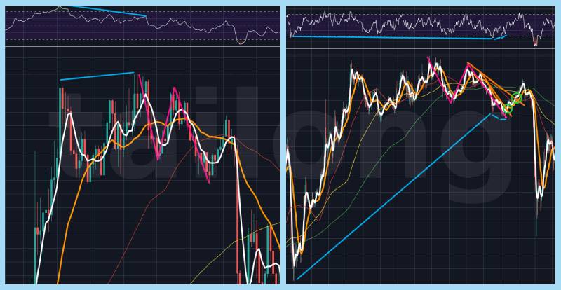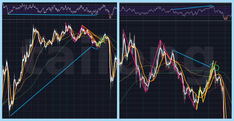 엘리어트 파동이론을 모른다고 하더라도, 단순하게 RSI 일반 상승다이버전스가 나온 후 상승반전한 다음에 최저점보다 높아진 위치에서 N자 모양을 마친 후 상승하는 것이 보인다면 이때 진입하는 것이 좋습니다. 이때 내가 보고 있는 차트 기준 높고 낮은 타임프레임에서는 상승근거를 강하게 주고 있습니다. 초록색으로 표시한 것과 같이 가격의 저점이 높아짐은 물론이고, 5이평(단순이동평균선) 같은 것들도 저점이 높아지는 형태가 나오죠. 위 그림 우측은 좌측의 반대니 별도 설명하지 않겠습니다.