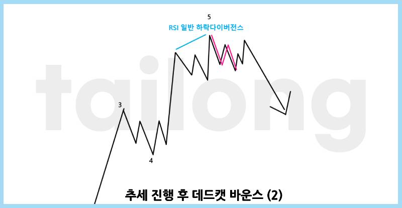추세 진행 후 데드캣 바운스란 '2-1) 추세 진행 중 눌림목'이 반복해서 나오다가, 고점이 형성(파동 종결, RSI 일반 하락다이버전스)된 후 2-2) 이전 추세대로 진행될 마지막 N파동입니다. 이 N파동은 고점 갱신을 전제로 하지 않기 때문에, 청산에 더 유의해야해요. 고점 형성이 아니라 저점 형성의 경우 데드캣 바운스라고 하진 않지만 원리는 동일합니다.