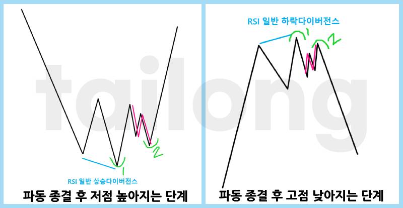 핵심은 하락하던 추세가 ⑴ 저점이 갱신되며 RSI 일반 상승다이버전스가 나오고, ⑵ 상승반전한 후 저점이 높아지는 자리에서 N파동이 나왔는가에요. (위 그림 우측은 ⑴ 고점이 갱신되며, RSI 일반 하락다이버전스가 나오고, ⑵ 하락반전한 후 고점이 낮아지는 자리에서 N파동이 나왔는가입니다.)
