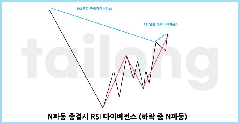 엘리어트 파동이론을 알면 위의 그림이 더 직관적으로 눈에 들어오겠지만, 엘리어트 파동이론을 모른다고 이 설명을 보면 N파동의 반전근거를 찾으실 수 있을 거에요. 위 그림들과 같이, N파동이 종결될 때에는 보통 RSI 히든 다이버전스와 RSI 일반 다이버전스가 나옵니다.