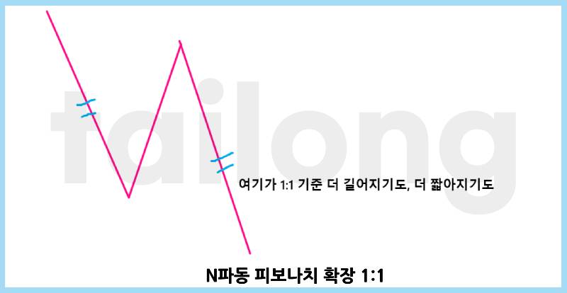 그리고 N파동은 보통 피보나치 확장 1:1으로 나오며, 더 짧아지기도 더 길어지기도 해요. 피보나치 확장과 되돌림 관련 내용은 아래 이전 게시글을 읽어주세요.