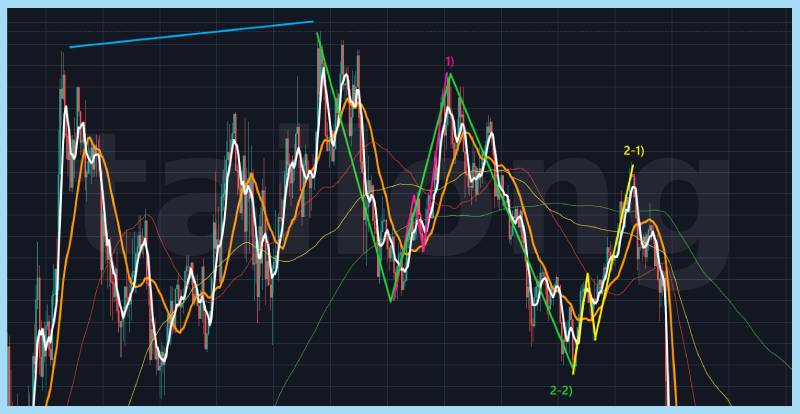 그것이 위 차트 우측) 의 예시입니다. 이 자리는 분홍색 N파동으로 반등하였지만, 이후 노란색 N파동(2-1)으로 반등하며 하락하게 되죠. 위 차트 좌측)과 같이 2-2) 분홍색 N파동으로 반등한 자리라도, 위 차트 우측)과 같이 2-1) 노란색 N파동으로 하락근거를 주고 하락하기에 충분한 청산근거가 생깁니다.