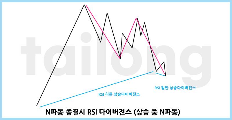 엘리어트 파동이론을 알면 위의 그림이 더 직관적으로 눈에 들어오겠지만, 엘리어트 파동이론을 모른다고 이 설명을 보면 N파동의 반전근거를 찾으실 수 있을 거에요. 위 그림들과 같이, N파동이 종결될 때에는 보통 RSI 히든 다이버전스와 RSI 일반 다이버전스가 나옵니다.