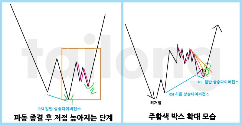 이 구간을 확대해서 본다면 위 그림 우측과 같이 보일 거에요. (세부적으로 여러 다양한 모습이 있지만 대표적인 모습으로 설명하겠습니다.) 위 그림 우측을 보면, 주황색 N파동이 종결되는 자리에서는 보통 낮은 타임프레임에서 RSI 히든 상승다이버전스와 RSI 일반 상승다이버전스가 나옵니다. RSI 히든, RSI 일반 다이버전스가 모두 나올수도, 둘 중 하나가 생략될수도, 둘 다 생략될수도 있지만 보통은 둘 중 하나라도 나오는 편이죠. 이렇게 저점이 높아지는 단계에서 분홍색 N파동은 완성되며 매수세가 강해집니다.