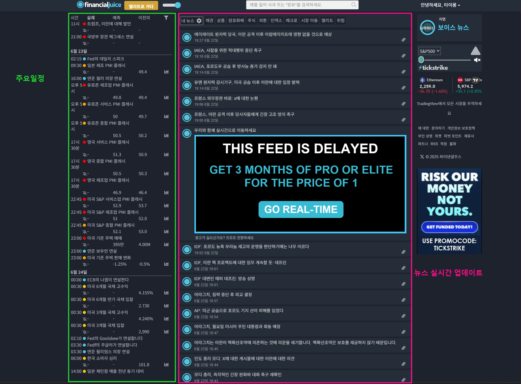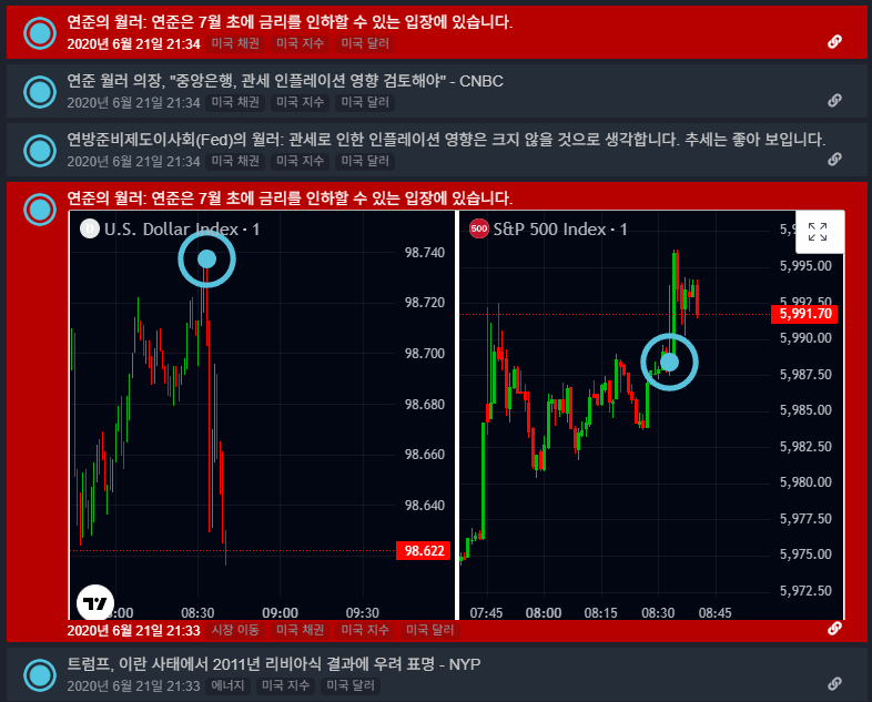위 그림의 좌측 초록색 박스 영역에서 주요 일정발표를 확인할 수 있고, 분홍색 박스에서 실시간 뉴스 업데이트를 확인할 수 있습니다.