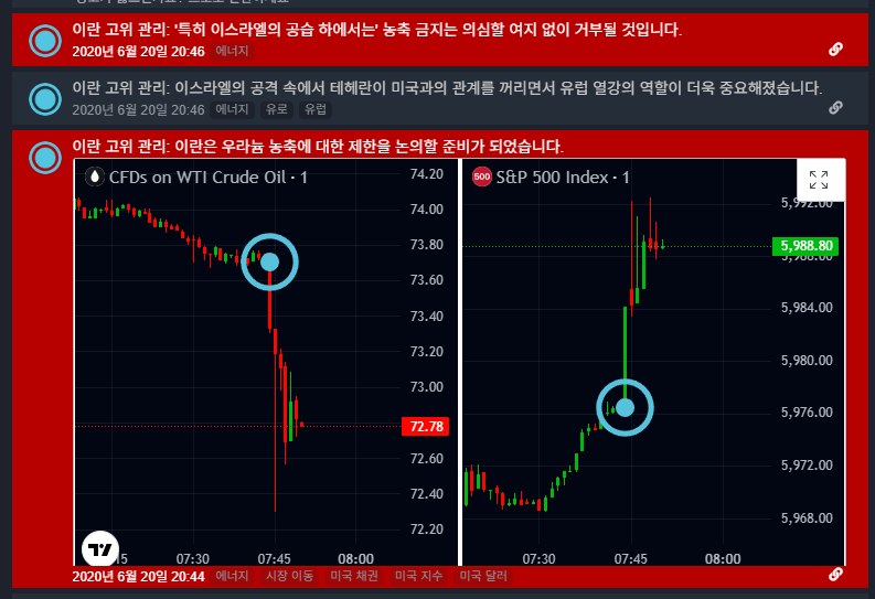 위 그림과 같이, 시장에 영향을 줄만한 뉴스에서 특정 종목이 급등 및 급락했다면, 뉴스 발생시기에 맞춰 차트도 같이 올라옵니다.
