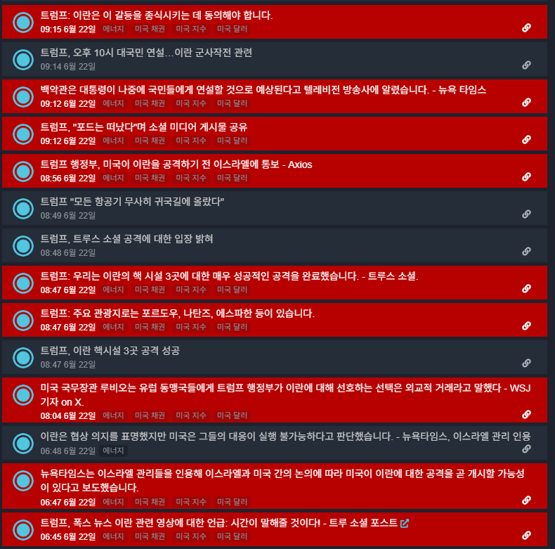 시장에 영향이 클 것 같은 이슈는 빨간색 배경처리가 된 채 뉴스가 올라옵니다.