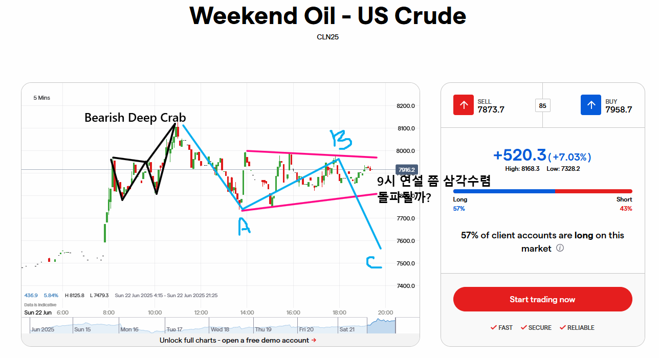 위와 같이 위켄드 오일에서 Bearish Crab이 나온 후 하락반전한 것이구나, 여기 30분 봉 RSI 일반 하락다이버전스도 있었을 수 있겠구나. 이후 현재 삼각수렴 중인데 25년 6월 22일 21시 트럼프가 얘기할 때쯤 삼각수렴이 돌파(상방이건, 하방이건)되겠구나. 이때 나스닥이나 비트코인은 어떻게 움직이겠구나 생각해볼 때 쓸만합니다. 월요일 오일은 갭상승하겠구나, 그리고 국장을 하고 있다면 원유 관련 주식을 팔지, 살지에 대해서도 미리 고민해볼 수 있죠.